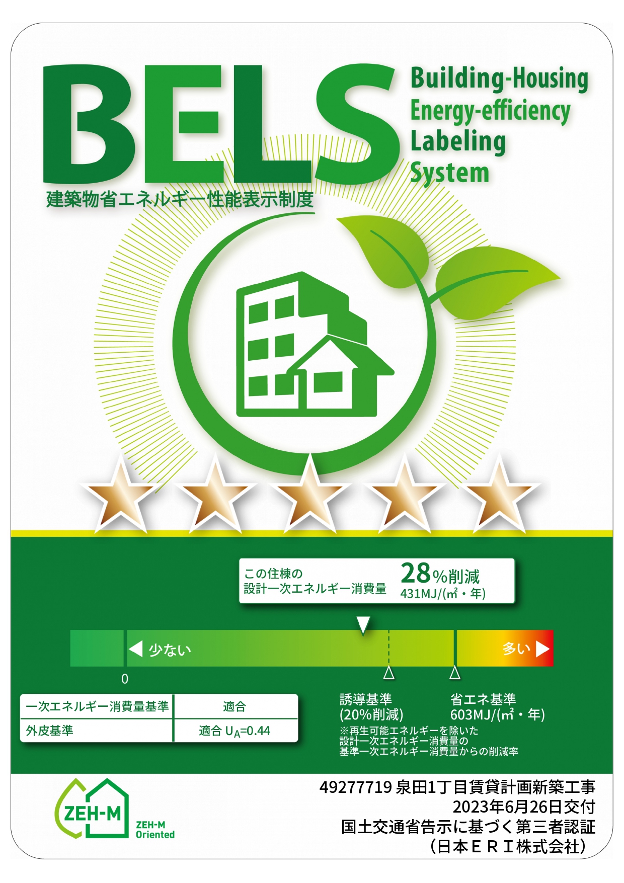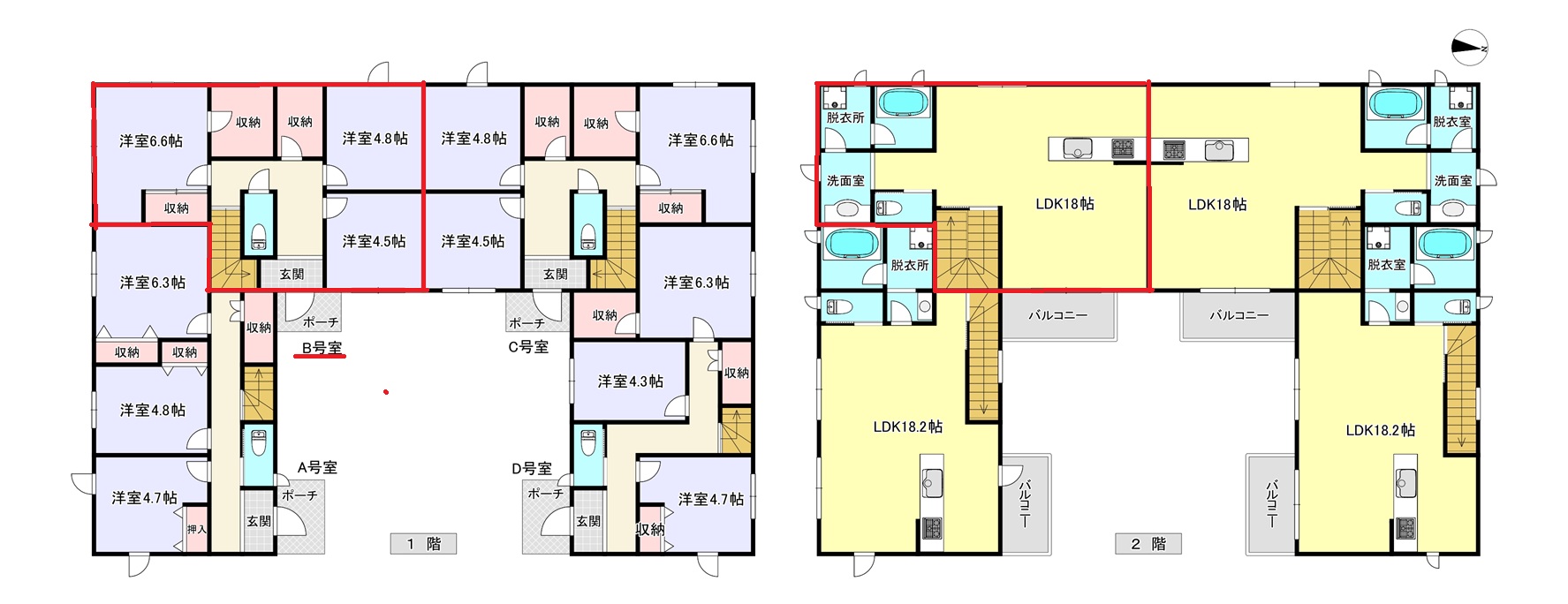 今回募集のお部屋は赤の線で囲っているB室になります。建物は中庭を囲むようなレイアウトになっており、2階建て連棟式(テラスハウス)タイプです。設計・施工は大手ハウスメーカーの「三井ホーム」さん。デザイン性に優れ、お洒落で高品質の住宅を提供している建築会社さんです。こちらの物件も「高品質・高性能」、間取りも特徴的でお洒落感満載の住宅となっています。さらに、省エネ賃貸住宅の認定である「BELS」も5スターを取得している最新の「省エネ賃貸住宅」なのです。