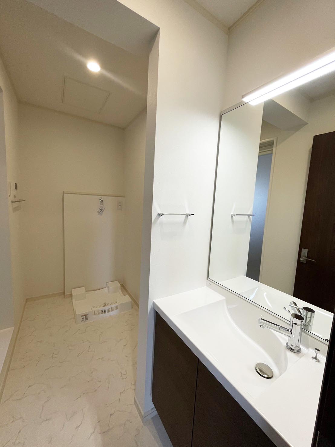 シャープな雰囲気の洗面台と脱衣室